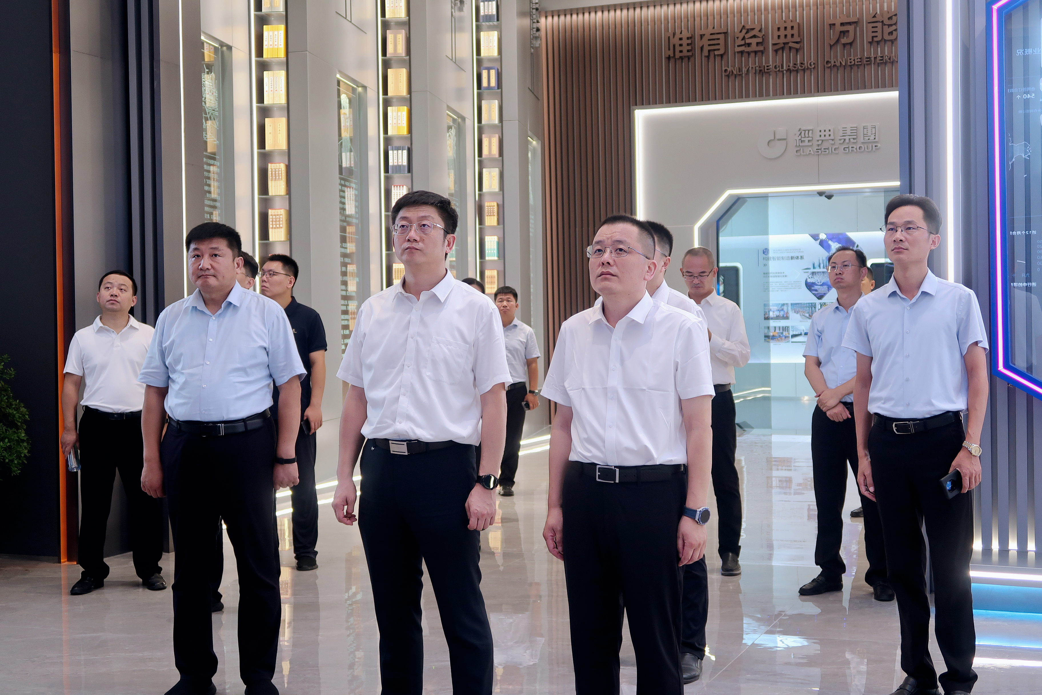 王慶書記一行來到集團(tuán)展廳察看工業(yè)數(shù)字化信息平臺(tái)建設(shè)情況,詳細(xì)了解了數(shù)字生產(chǎn)、數(shù)字設(shè)備、數(shù)字孿生以及產(chǎn)業(yè)數(shù)字化發(fā)展等情況,對(duì)經(jīng)典集團(tuán)數(shù)字化轉(zhuǎn)型的先進(jìn)做法和取得成效給予了充分肯定。他強(qiáng)調(diào),要繼續(xù)保持創(chuàng)新發(fā)展的良好勢(shì)頭,加快推進(jìn)數(shù)字化轉(zhuǎn)型,不斷深化數(shù)字賦能工業(yè)發(fā)展,探索更多新技術(shù)、新應(yīng)用、新模式,進(jìn)一步提升企業(yè)的智能化水平和核心競(jìng)爭(zhēng)力。