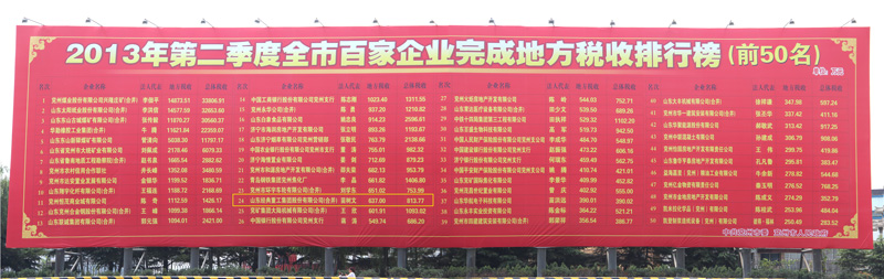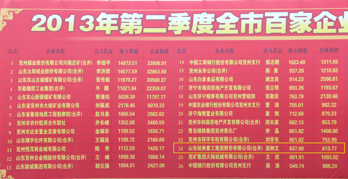2013年7月7日,兗州市公布了第二季度納稅前50強企業排行榜,山東經典重工集團股份有限公司第二季度完成地方稅收637萬,總體稅收813.77萬,躍升兗州生產制造業前十強。全市排名第24位,比上一季度提升2位!